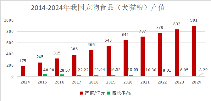 中国农业科学院饲料研究所宠物营养团队数据统计显示,2024年我国宠物犬猫饲养量达1.4亿只,宠物产业总规模突破3000亿元,其中宠物食品市场占比最高。到2024年,宠物食品犬猫粮市场规模达到900亿元,比2023年增长8.3%。